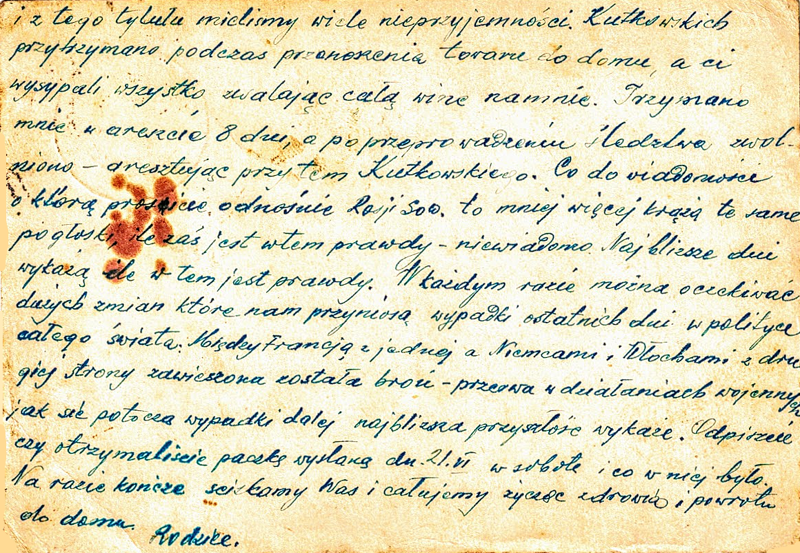 Drodzy Synowie, List napisany 24 czerwca otrzymaliśmy 26 czerwca. Jesteśmy bardzo wdzięczni. Tutaj nic nowego. Cieszymy się, że wkrótce wrócisz do domu. Andrzejewski wysłał do domu list z informacją, że Jakoby Jadzik ma zostać wysłany do Berlina. Czy to prawda? Daj nam znać. Nie ma tu wielu zmian. Firma Jabłockiego została zamknięta przez policję. I przez to mieliśmy sporo kłopotów. Kutowscy przestali przewozić towary do domu i wszystko rzucili, a winę zwalili na mnie. Ja byłem przetrzymywany w areszcie przez osiem dni i po śledztwie zostałem zwolniony, a zamiast mnie aresztowano Kutowskiego. Jeśli chodzi o przesłanie, o które prosiłeś, to o Rosji – plotki są mniej więcej takie same. Nie wiem, jak bardzo mogą być. Pokażą nam nadchodzące dni. Zresztą w najbliższych dniach możemy spodziewać się dużych zmian geopolitycznych. Zawieszenie broni miało miejsce między Francją z jednej strony a Niemcami i Włochami z drugiej – koniec działań wojennych. Co będzie dalej – pokaże nam najbliższa przyszłość. Daj nam znać, czy otrzymałeś przesyłkę, którą wysłaliśmy do Ciebie w sobotę 21 czerwca i powiedz nam również, co było w środku. Na razie wystarczy, przesyłamy uściski i buziaki i życzymy powrotu do domu. Rodzice.