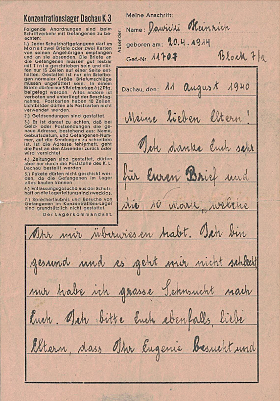 Letter written on August 11, 1940, postmarked on the 20th, by Heinrich Dawicki, age 33, to his parents in Lodz, Poland from Dachau
