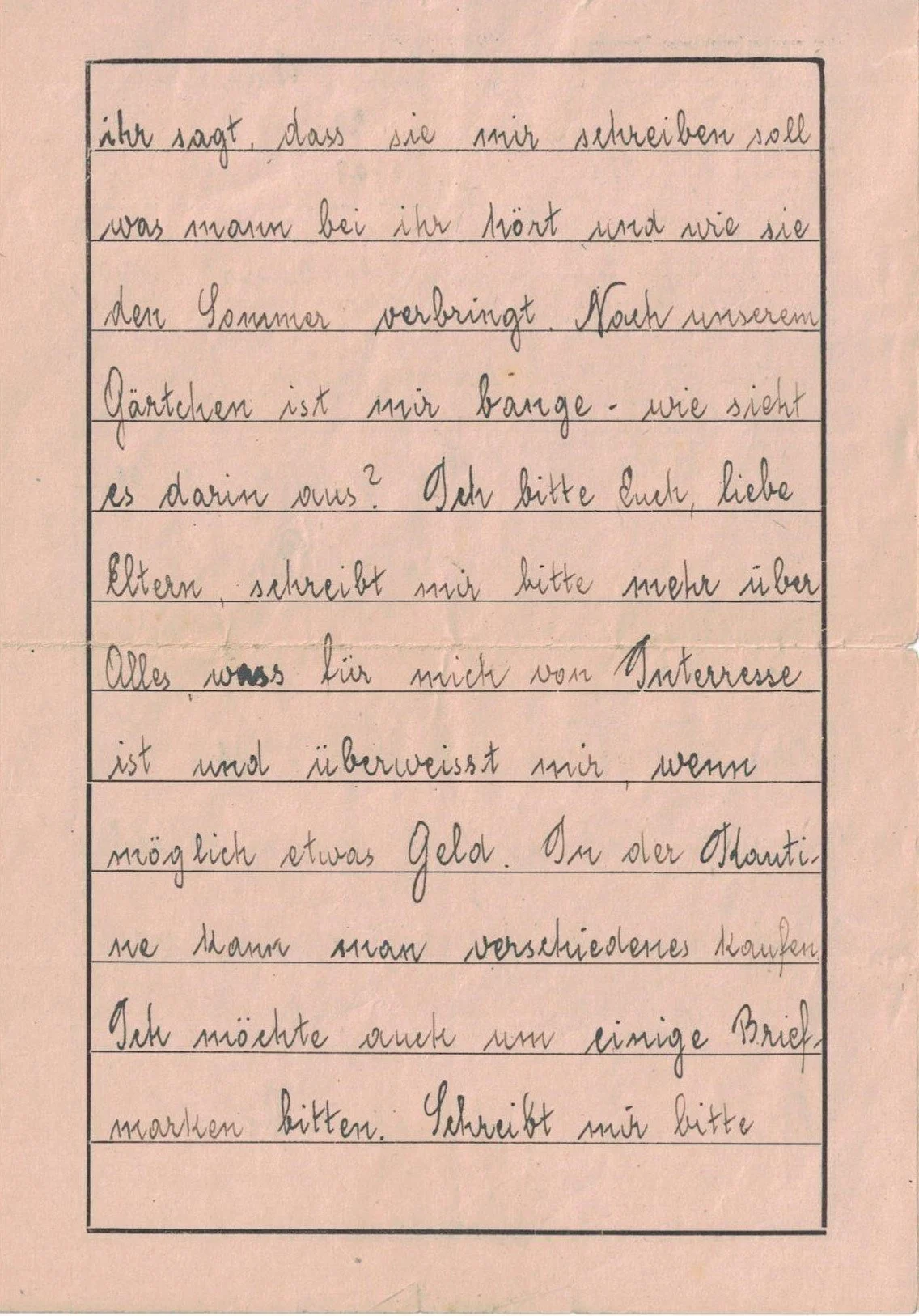 Meine lieben Eltern! Ich danke Euch sehr für euren Brief und die 10 Mark, welche Ihr mir überweisen habt. Ich bin gesund, und es geht mir nicht schlecht, nur habe ich große Sehnsucht nach euch. Ich bitte euch ebenfalls, liebe Eltern dass Ihr Eugenie besucht und ihr sagt, dass sie mir schreiben soll was man bei ihr hört und wie sie den Sommer verbringt. Nach unserem Gärtchen ist mir bange - wie sieht es darin aus? Ich bitte euch, liebe Eltern, schreibt mir bitte mehr über Alles, was für mich von Interesse ist und überweist mir, wenn möglich etwas Geld. In der Kantine kann man verschiedenes kaufen. Ich möchte auch um einige Briefmarken bitten. Schreibt mir bitte sofort nach Erhalt dieses Schreibens ausführlich über Alles, denn ich erwarte eure Briefe immer mit Ungeduld. Die herzlichsten Grüße für alle Verwandten und Bekannten wie auch für Herrn Alfrool Herrnivans. Den Vater, Mama, Schwester Marysia, den Schwager Janek, Nichte Teresa und meine Verlobte Eugenie und ihrer Familie, küsse ich tausendmal. Euer