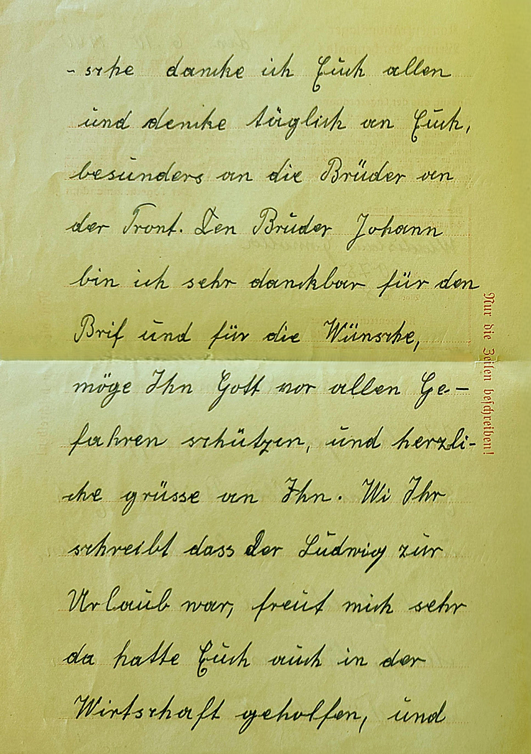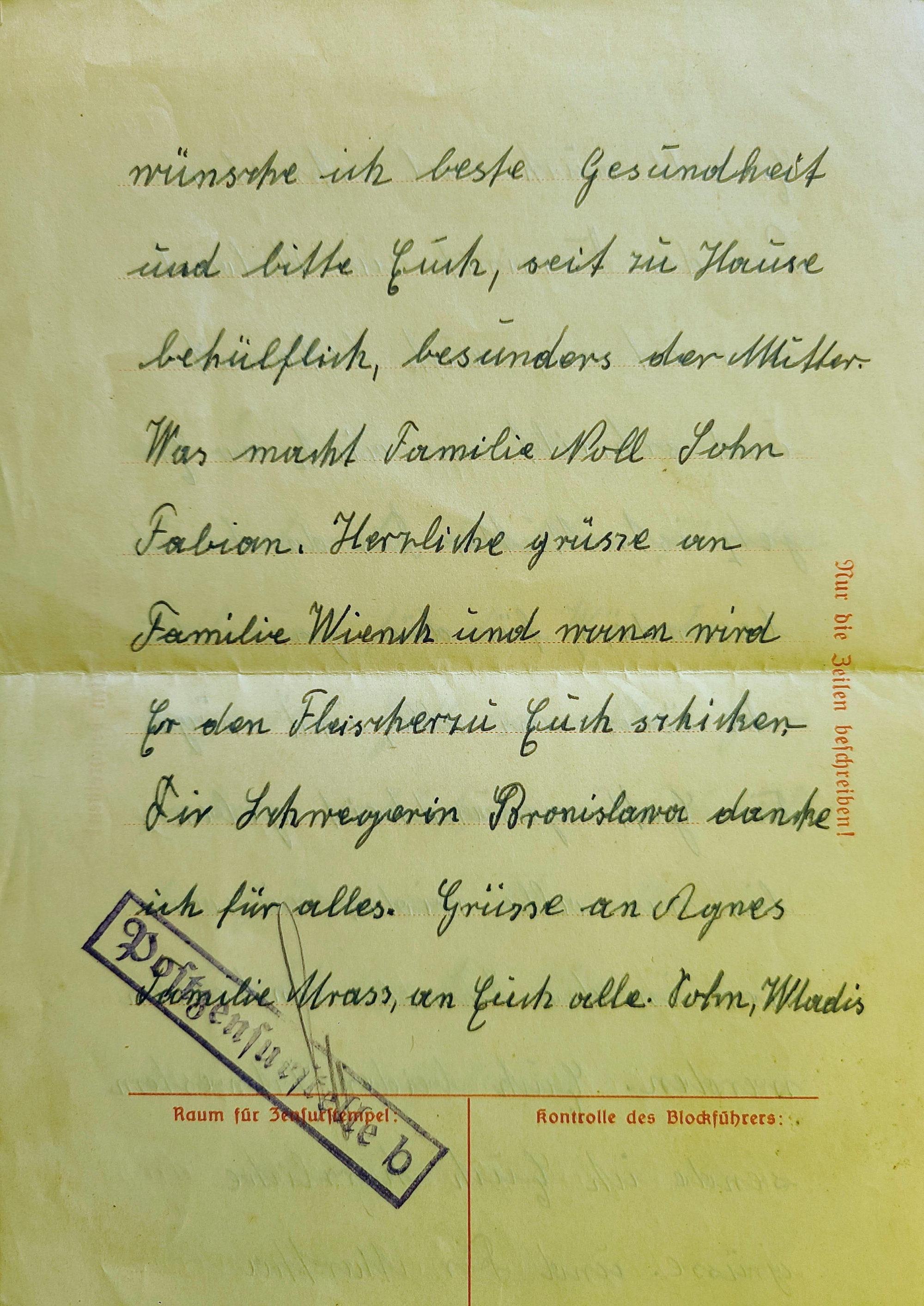 Meine Lieben, Ich bin gesund und hoffe von Euch, dass selbe. Brief von Euch und Johann habe ich erhalten, und Geld zwei Mal zu 15 März, für was ich sehr dann he. Für die Gebers fein nein danke ich Euch allen und danke sanglich von Euchen besonders an den Bruder der Front. Den Bruder Johann bin ich sehr dank Bon für den Brief und für die Wunsche, möge Ihn goss nur allen Gefahren schützen und herzliche Grüße an Ihr. Wie Ihr schreibt, dass Ludwig zur war, freit mich sehr da hasse Euch muh sehr da hasse Euch in der Wirtschaft geholfen, und für soll auch mal schreiben. Das Dominik zur war ist mir auch bekannt. Und schreibt mir mich, wo Er jetzt ist. Mütter dir danke ich besonders, für die ganze Mühe über und alle, und möge Der Gott Gesundheit geben, bis wir alle wieder zus. am man in die Familie einkehren werden. Eich beiden Lichtenstern sende ich Euch herrliche Grüße, end Für Martha wünsche ich beste Gesundheit und bitte Euch, seit zu Hause behülft ich, besonders der Miller. Was macht Familie Noll John Fabian. Herrlichem Gruße an Familie Wienik und waren wird Er den Fleischherzu Euch schicken Dir Schenkerin Bronislawa danke ich für alles. Grüße an Agnes verflicht Mrass an Euch alle. Sohn Wladis