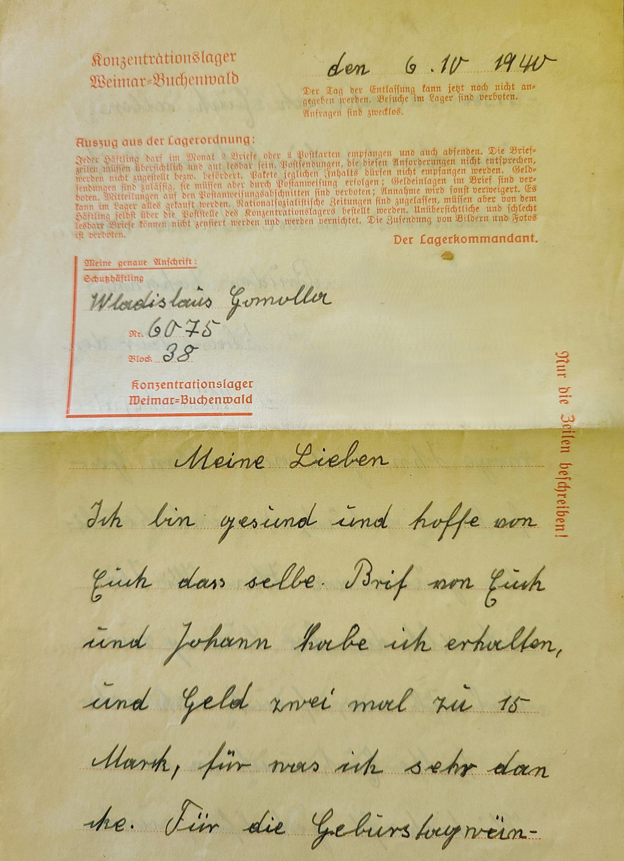 Letter written on October 6, 1940 by Wladislaw Gomolla to his family from Buchenwald