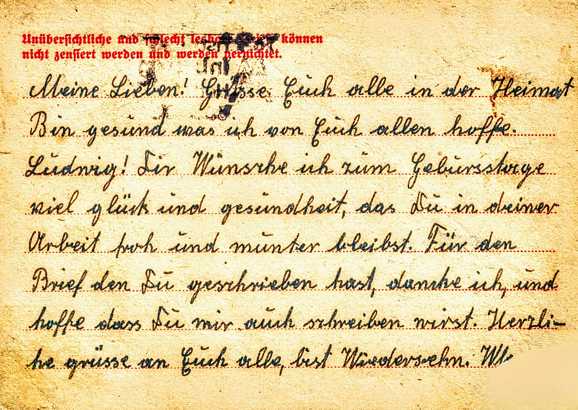 Meine Lieben! Grüsse Euch alle in der Heimat. (Ich) bin gesund, was ich von Euch allen hoffe. Ludwig! Dir wünsche ich zum Geburtstag viel Glück und Gesundheit, das du in deiner Arbeit froh und munter bleibst. Für den Brief, den du geschrieben hast, danke ich und hoffe dass du mir auch schreiben wirst. Herzliche Grüsse an euch alle, bis Wiedersehen.