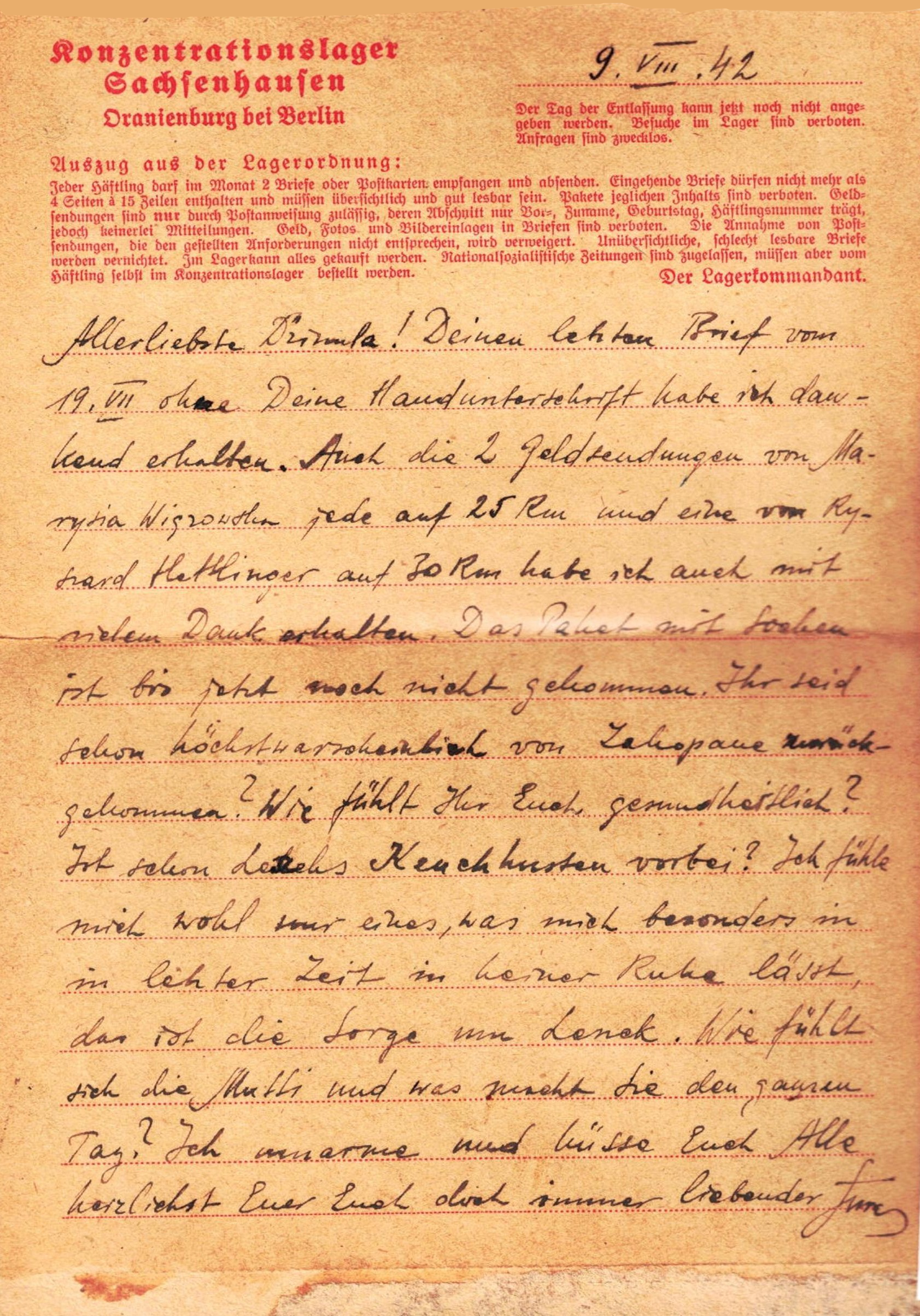 Letter written on August 9, 1942, postmarked on the 11th, by Georg Wolski to his wife Hedwig in Mielec, Poland from Sachsenhausen