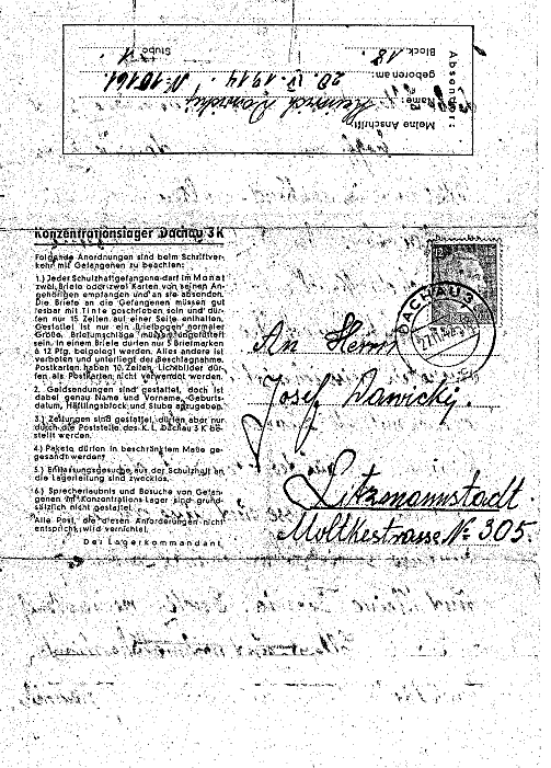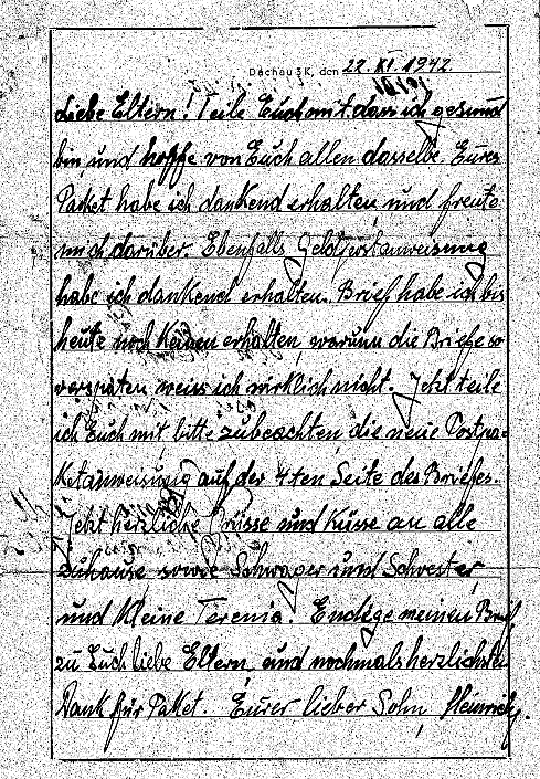 Letter written on November 22, 1942, by Heinrich Dawicki, age 36, to his sister and parents in Lodz, Poland from Dachau