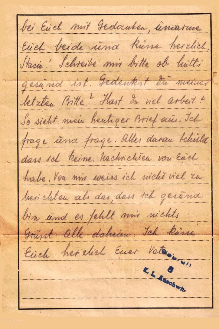 Letter written on April 23, 1944, postmarked on the 28th, by Stanislaw Michalek, age 45, to his daughter Stanislawa, in Krakow, Poland from Auschwitz
