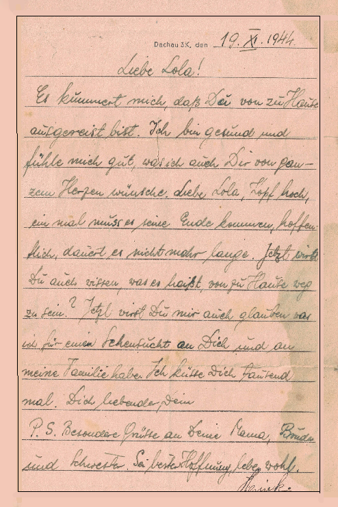 Letter written on November 19, 1944, postmarked on the 22nd, by Heinrich Dawicki, age 38, to his friend Lola and his parents in Lodz, Poland from Dachau