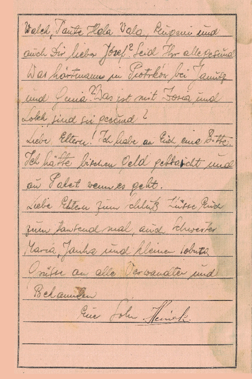 Dear Lola! I’m very worried that you left home. I am healthy and feel good, which I also wish for you with my whole heart. Dear Lola, keep your chin up, it must end at some point, hopefully it won’t last for much longer. Now you will also know what it means to be away from home? Now you will also believe what longing I have for you and for my family. I kiss you a thousand times over. Your lover who loves you. PS: Special greetings to your mama, brother, and sister. Keep hope alive, fare well. Dear parents! I received with gratitude your letter from November 8th. The money, 50 Reichsmarks, and the package with fruit I also received. My sincere thanks for all of this. Dear parents, I am happy, which I also hope of you. I’m curious how our father looks, whether he is still employed at his old position. Dearest Janku, and you, too, dearest Marytin and little Terenin, what’s new with you, are you healthy? Janku, where are your brothers and your sister at, how are they doing. Dear parents, what’s new with Aunt Kazia and how is she doing? How is Uncle Walek, Aunt Hela Wala, Eugeni and you, dear Josef? Are you all healthy? What do you hear in Piotrków with Janúsz and Genia? What’s up with Josia and Lolek, are they in good health? Dear parents! I have a request of you. I would need a little money and a package if it’s possible. Dear parents, in closing I kiss you a thousand times over, also sister Maria, Janka, and little [illegible]. Greetings to all the relations and acquaintances. Your son,