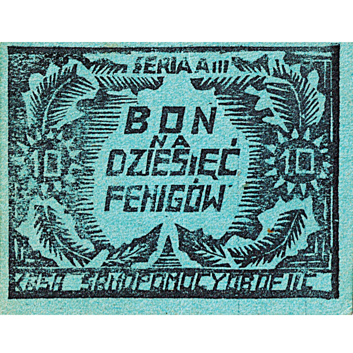 "Bon" (coupon) from the Oflag II-C camp for Polish POWs in Dobiegniew, Poland worth "Dziesięć Fenigów (10 Pfennigs); "Kasa Samopomcy" (Self-help fund) Serja AIII (Series AIII)