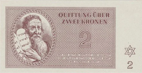 Quittung (coupon) for Theresienstadt, Czechoslovakia worth 2 Kroner. Shows Moses pointing to the 6th commandment, "Thou Shall Not Kill". WER DIESE QUITTUNG VERFALSCHT ODER NACHMACHT ODER GEFÄLSCHTE QUITTUNGEN IN VERKEHR BRINGT WIRD STRENGSTENS BESTRAFT (Whoever falsifies or counterfeits this receipt or brings falsified receipts into circulation, will be severely punished)